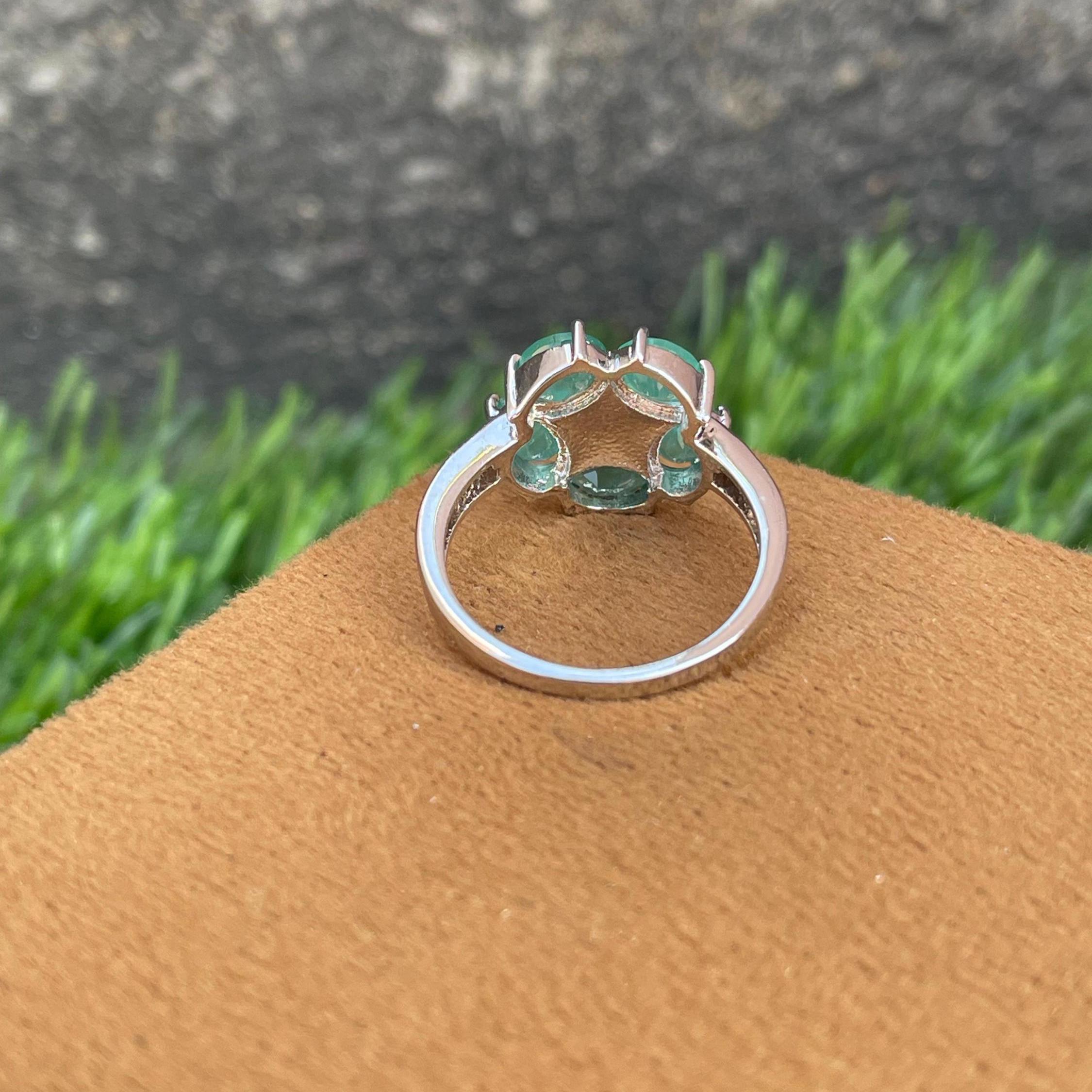 92.5 Sterling Silver Floral Ring With Natural Zambian Emerald -Dainty Emerald Cluster Ring -Minimalist Ring – Bluish Green Gemstone-Gift her