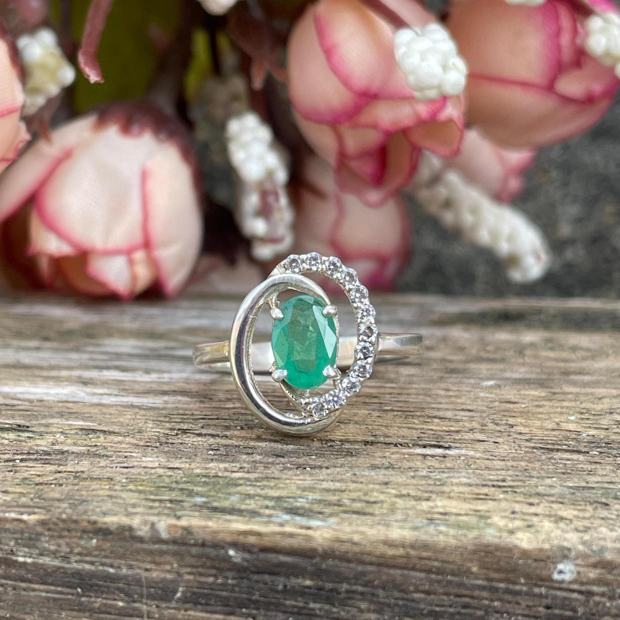 925 Sterling Silver Ring- Natural Zambian Emerald Ring- Oval Cut Gemstone CZ Halo Ring- Elegant Silver Ring- Minimalist Ring For Women